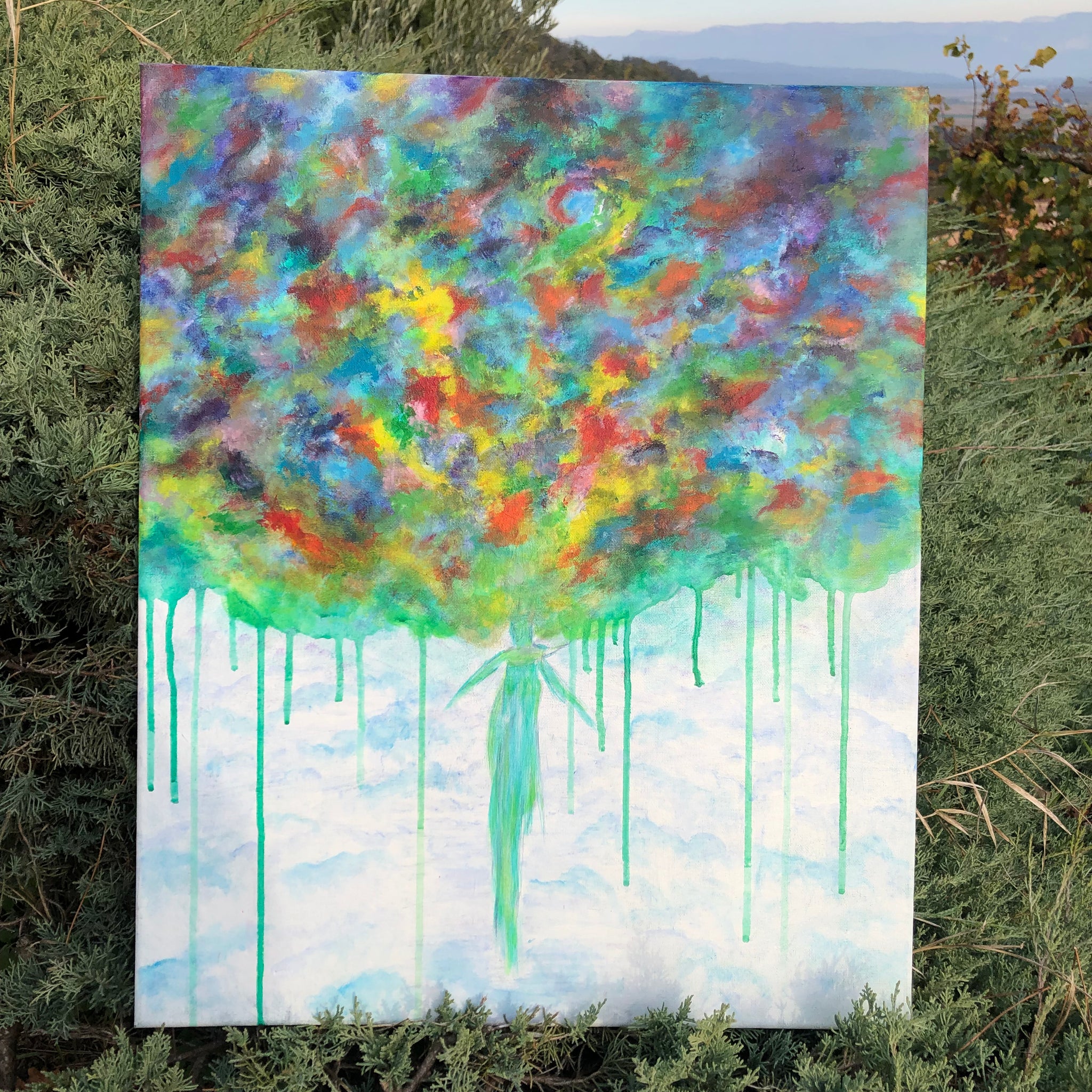 Une toile en coton sur laquelle est représentée un arbre dont le tronc est une femme. Peut être dame nature...