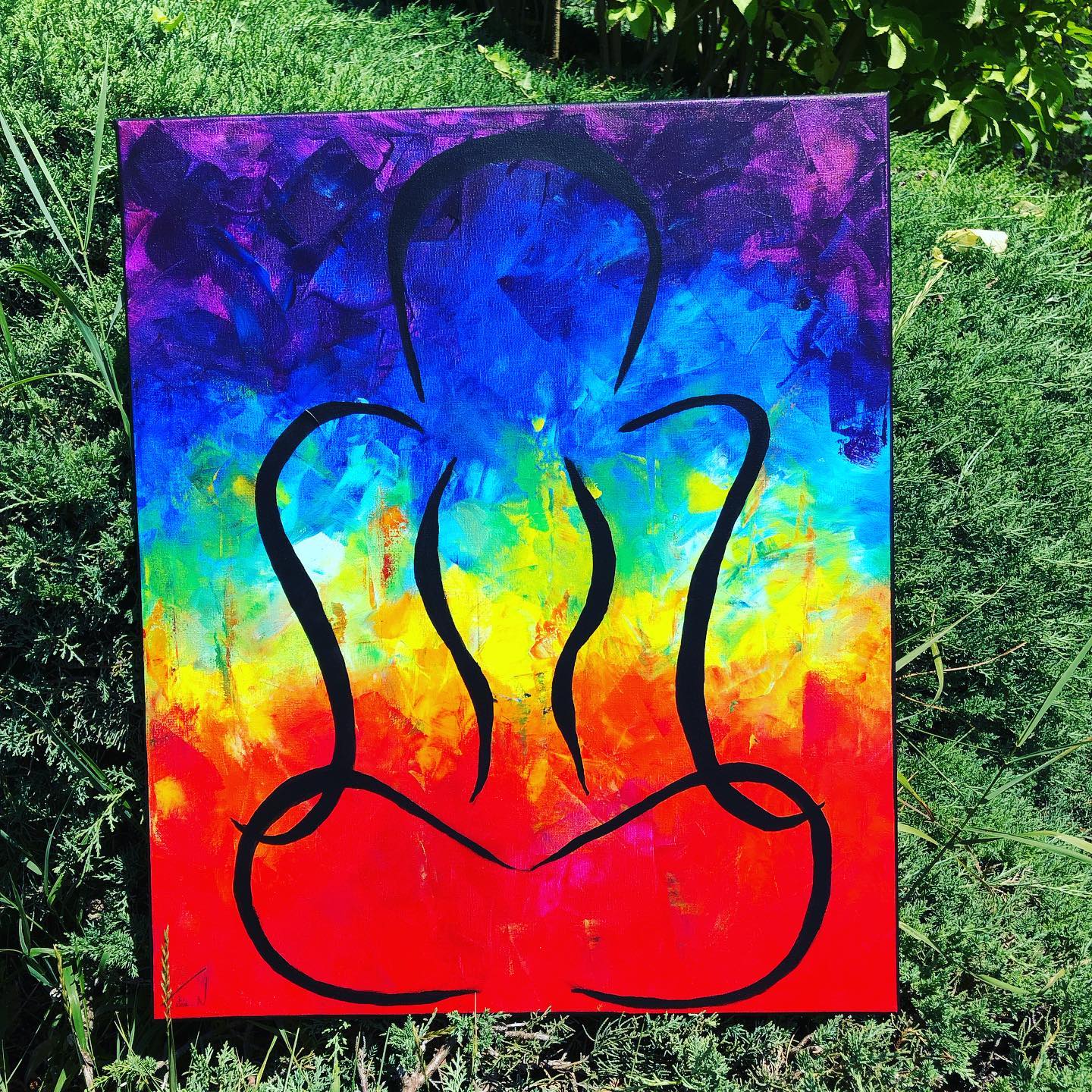 Tableau en coton aux couleurs du chakras représentant une personne en position de yoga le lotus . Idéal pou la méditation