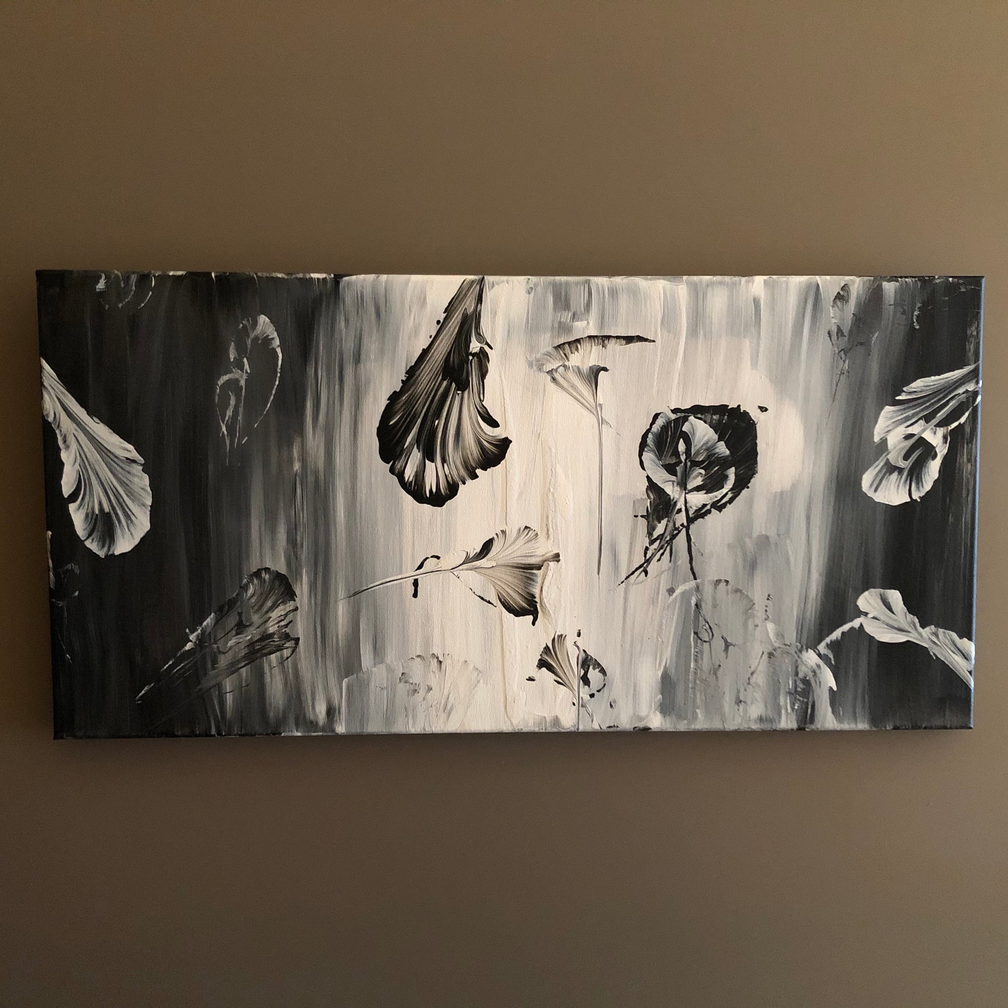 Une toile en coton sur laquelle est représentée des fleurs en noires et en blanches.