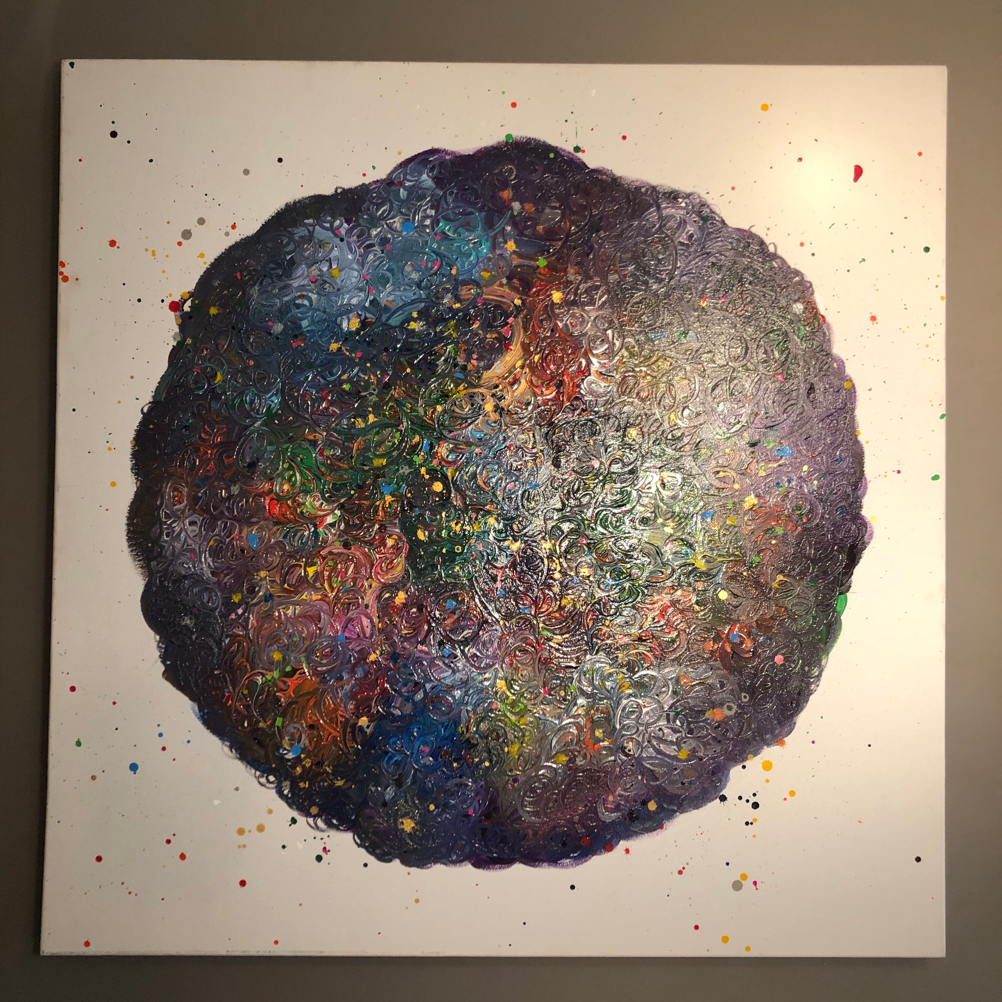 Une toile en coton sur laquelle est représentée un virus au allure sombre mais une fois à la lumière, il s'illumine de couleurs