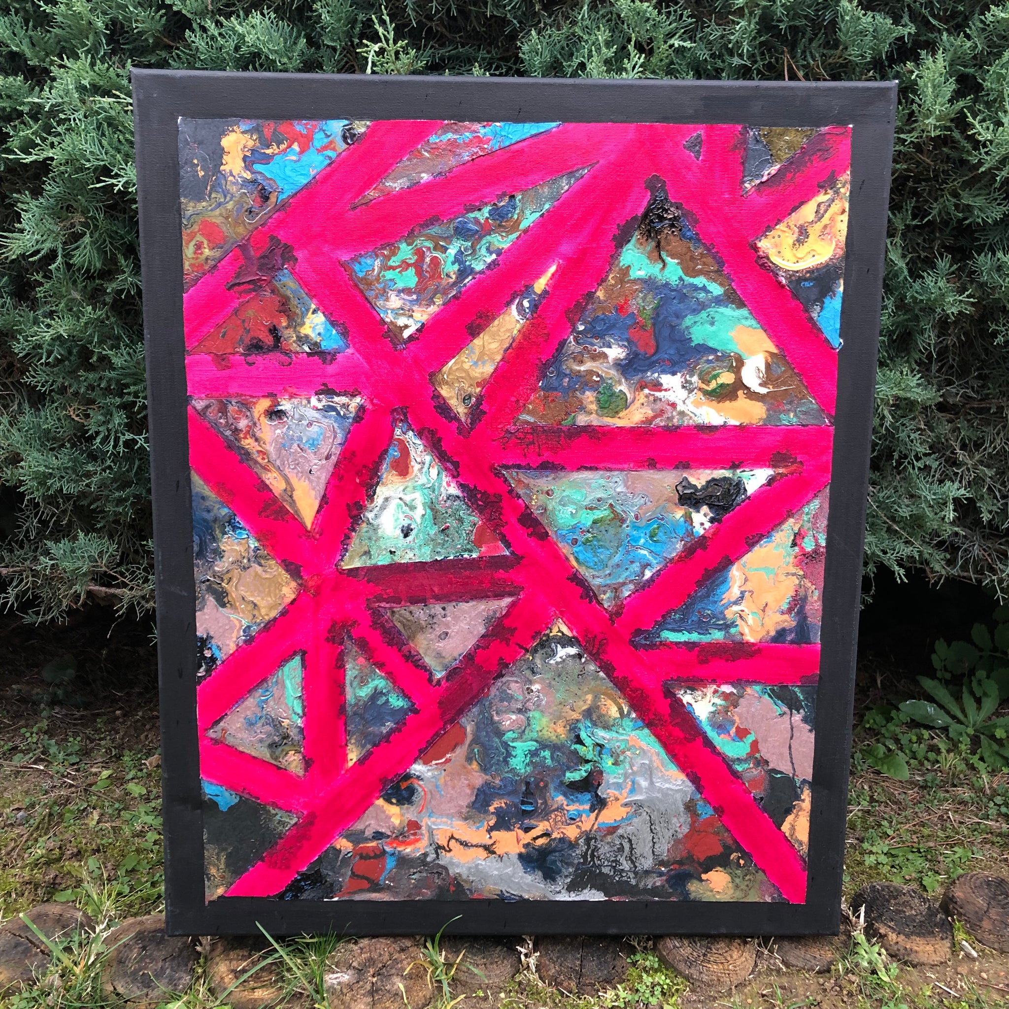 Une toile en coton sur laquelle est représentée des triangles rouges et des triangles couleurs opaques à effets miscibles entre elles.
