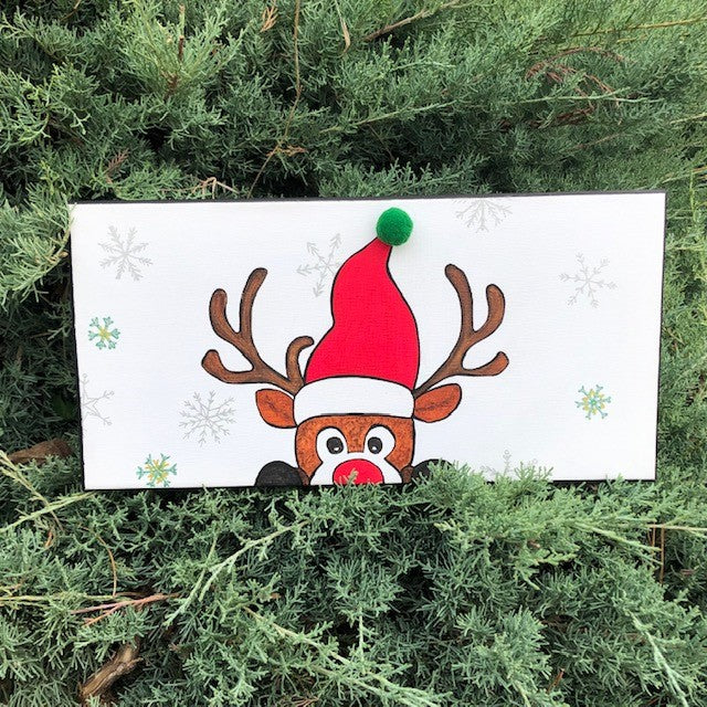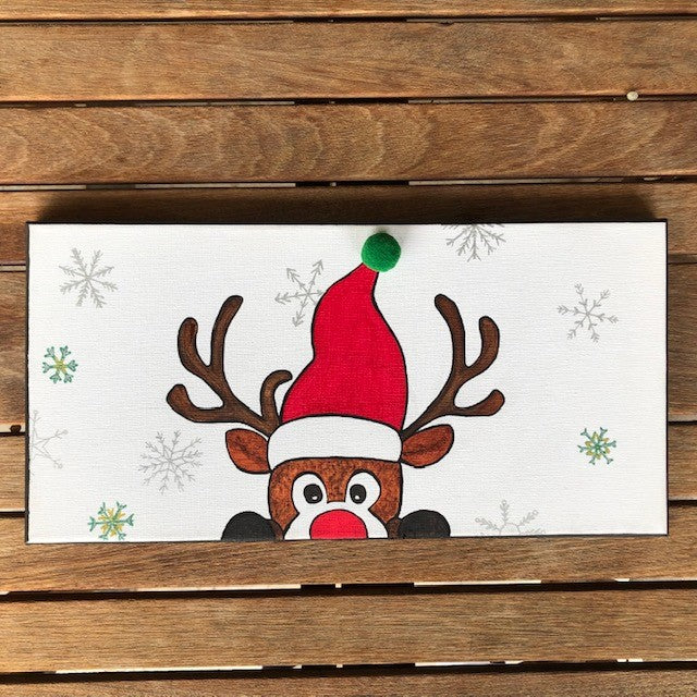 Une toile en coton représentant la tête d'un cerf de noël avec son bonnet rouge et son pompon vert