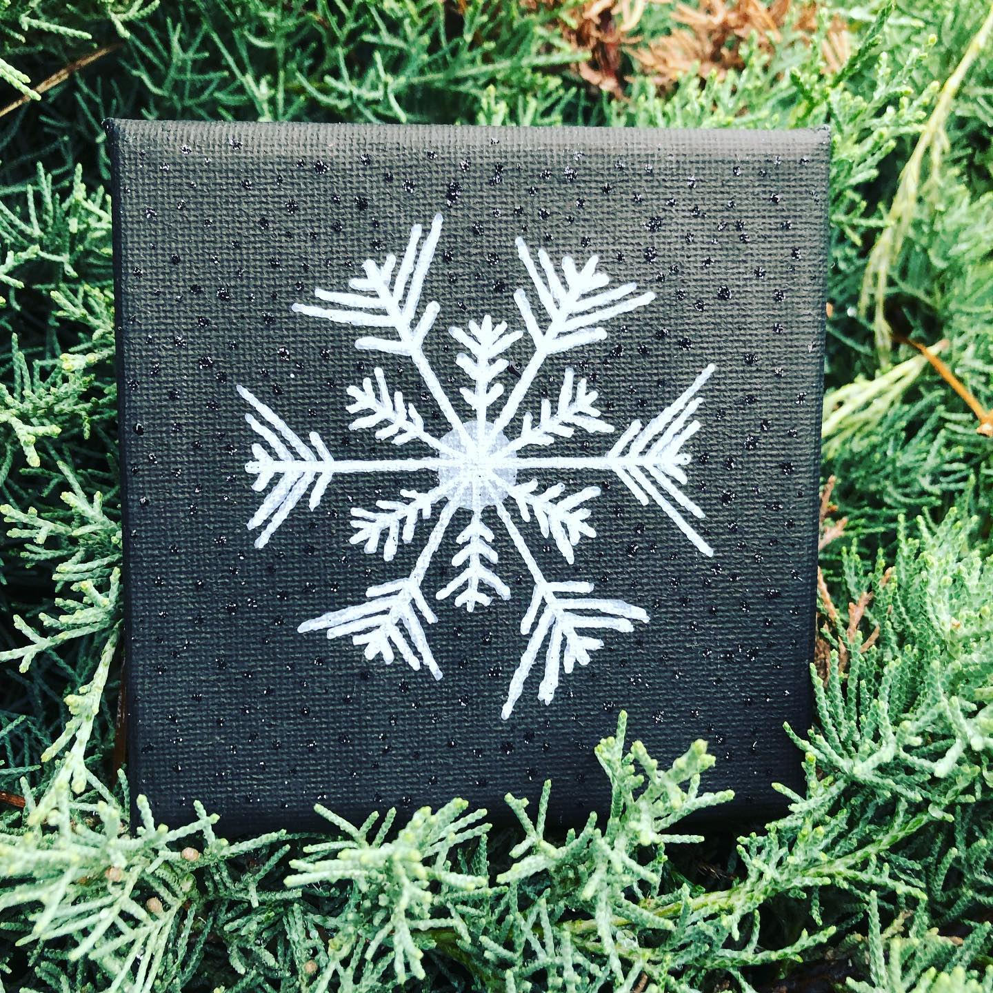 Tableau en coton représentant un flocon de neige sur un fond noir pailleté