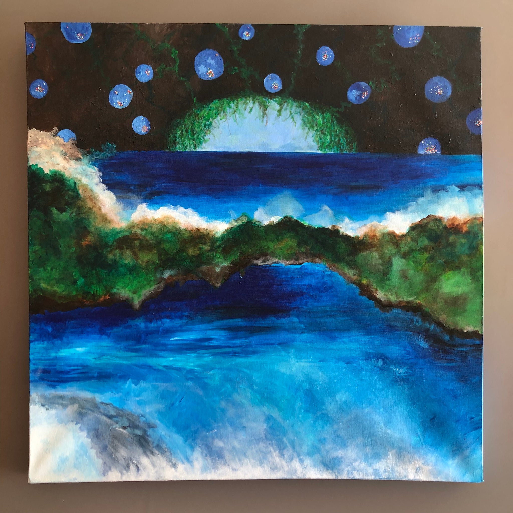 Tableau en toile de coton représentant un paysage dans grotte d'où jaillit de l'eau